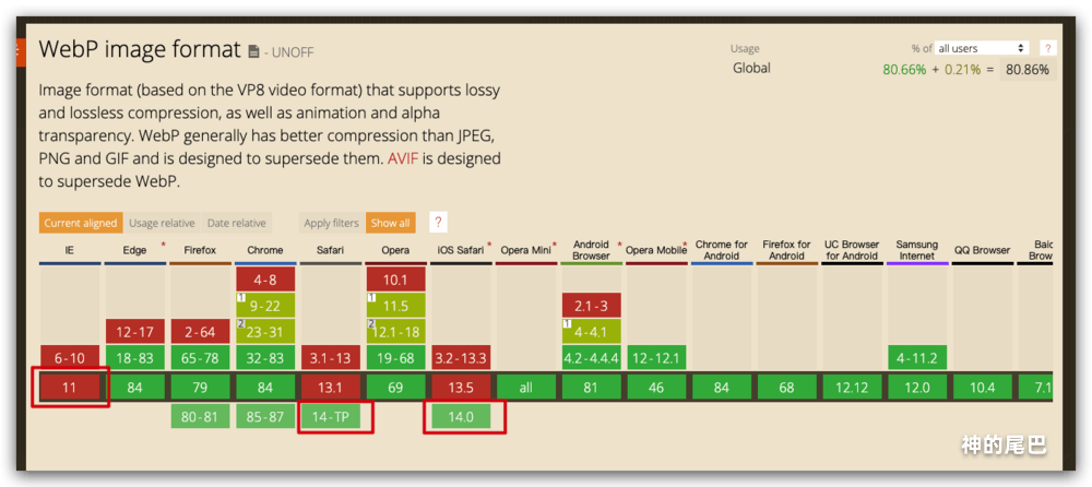 如上所示,除了微软家自己放弃的IE,其他平台基本都支持(Safari 14.0支持 WebP)。